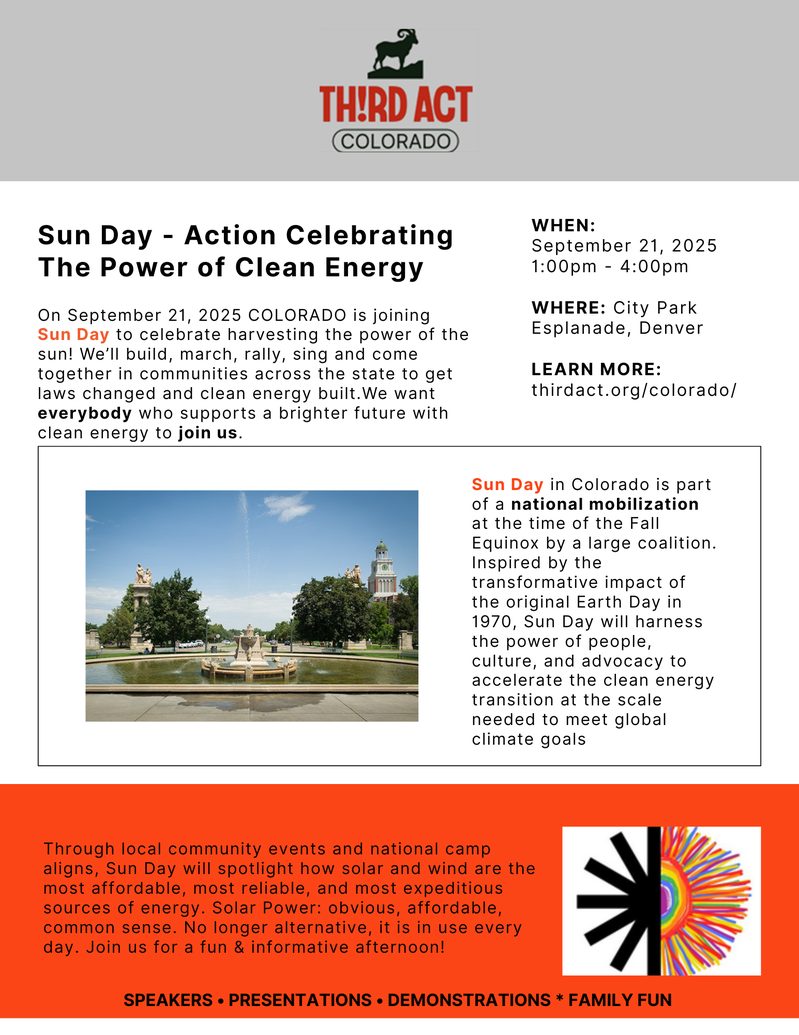 Th!rd Act Colorado is hosting an event celebrating Clean Energy and Electric Vehicles at City Park Esplanade from 1-4 PM on September 21. They are interested in having our band join for some marching and music to help celebrate the power of clean energy.